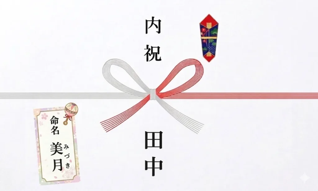 地域によっては、のしには「名字」を書き、横に「命名札(赤ちゃんの名前が書かれた短冊)」を添える習慣があります。迷ったらご実家の地域の風習を確認してみるのが安心です。
