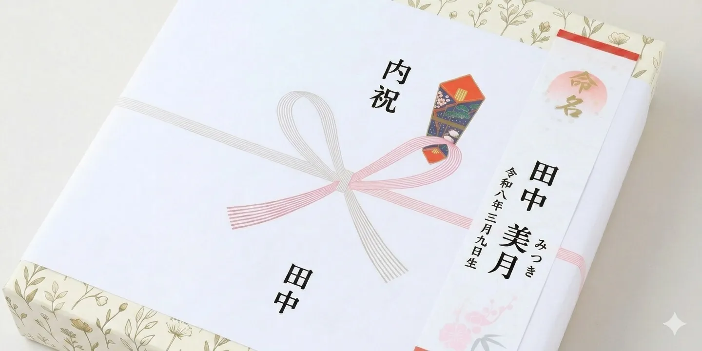 地域によっては、のしには「名字」を書き、横に「命名札(赤ちゃんの名前が書かれた短冊)」を添える習慣があります。迷ったらご実家の地域の風習を確認してみるのが安心です。